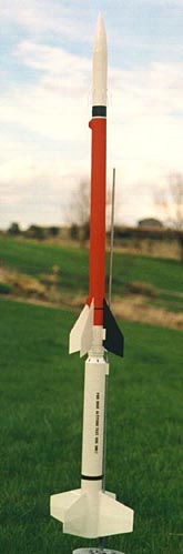 This is an Estes Pro Series kit. The Terrier actually comes with plywood centering rings, but has the same cheap two-piece plastic fins as my Python. The Sandhawk was hard to build as the plastic fins were partially warped. I used wire from big paper clips for the antennae, as the plastic ones it comes with won't even make to the launch site. The payload section has cheap, small plastic tabs to twist on the nose cone, and of course they broke off. I just glued the payload section shut. All that aside, the finished rocket looks great and flies quite well. I flew the Sandhawk alone but lost the nose cone/payload section on 7/31/97. Finally got a replacement part and finished the new payload section 3/1/98.
